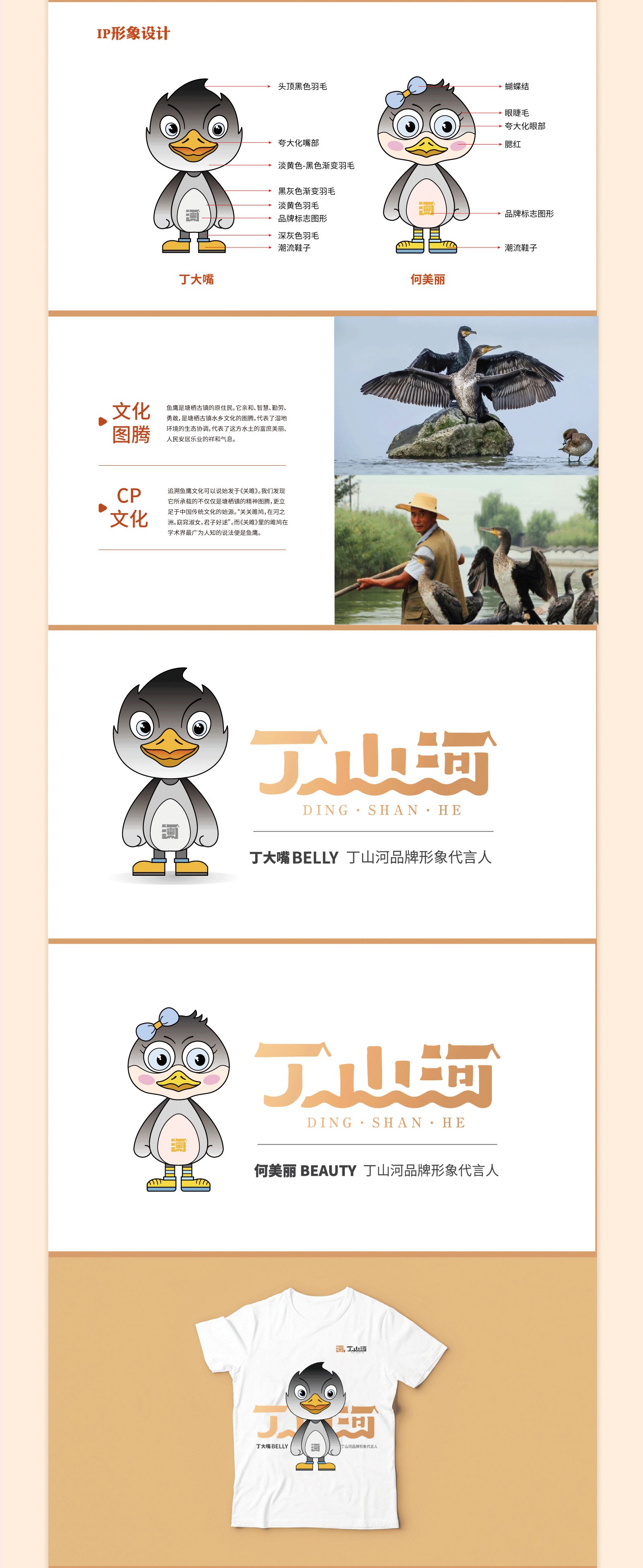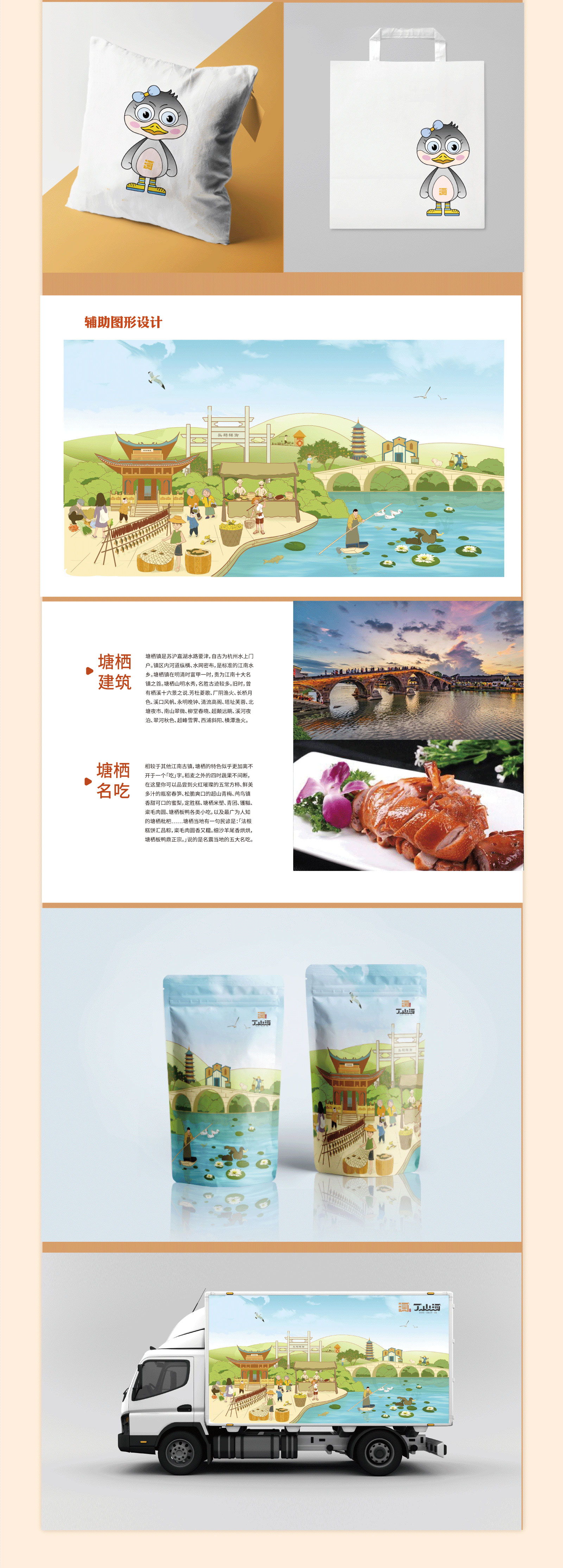 LOGO是消費(fèi)者認(rèn)識(shí)一個(gè)品牌的開(kāi)端,不僅是品牌視覺(jué)傳達(dá)要素的核心,也是品牌開(kāi)展信息傳播的主導(dǎo)力量。結(jié)合丁山河的品牌特點(diǎn),在logo設(shè)計(jì)時(shí),以“河”為主體,將“丁”“山”二字巧妙融合,組成一個(gè)獨(dú)特的圖形符號(hào),寓意美好,記憶點(diǎn)明顯;此外,還加入了“廣濟(jì)橋”“乾隆御碑”等具有當(dāng)?shù)靥厣姆?hào),展現(xiàn)江南名鎮(zhèn)古韻的特色,地域性鮮明,易于辨認(rèn),也有助于將品牌與消費(fèi)者連接起來(lái),始之成為品牌與受眾的橋梁。同時(shí)我們還對(duì)其輔助圖形進(jìn)行了設(shè)計(jì),利用原創(chuàng)手繪的形式,將塘棲古鎮(zhèn)的本土建筑、特色進(jìn)行呈現(xiàn),展現(xiàn)地方原貌,突出當(dāng)?shù)靥厣M(jìn)而拉近與消費(fèi)者的距離,幫助消費(fèi)者更好的了解品牌。另外,我們還對(duì)丁山河的IP進(jìn)行打造,獲得客戶(hù)的認(rèn)可。