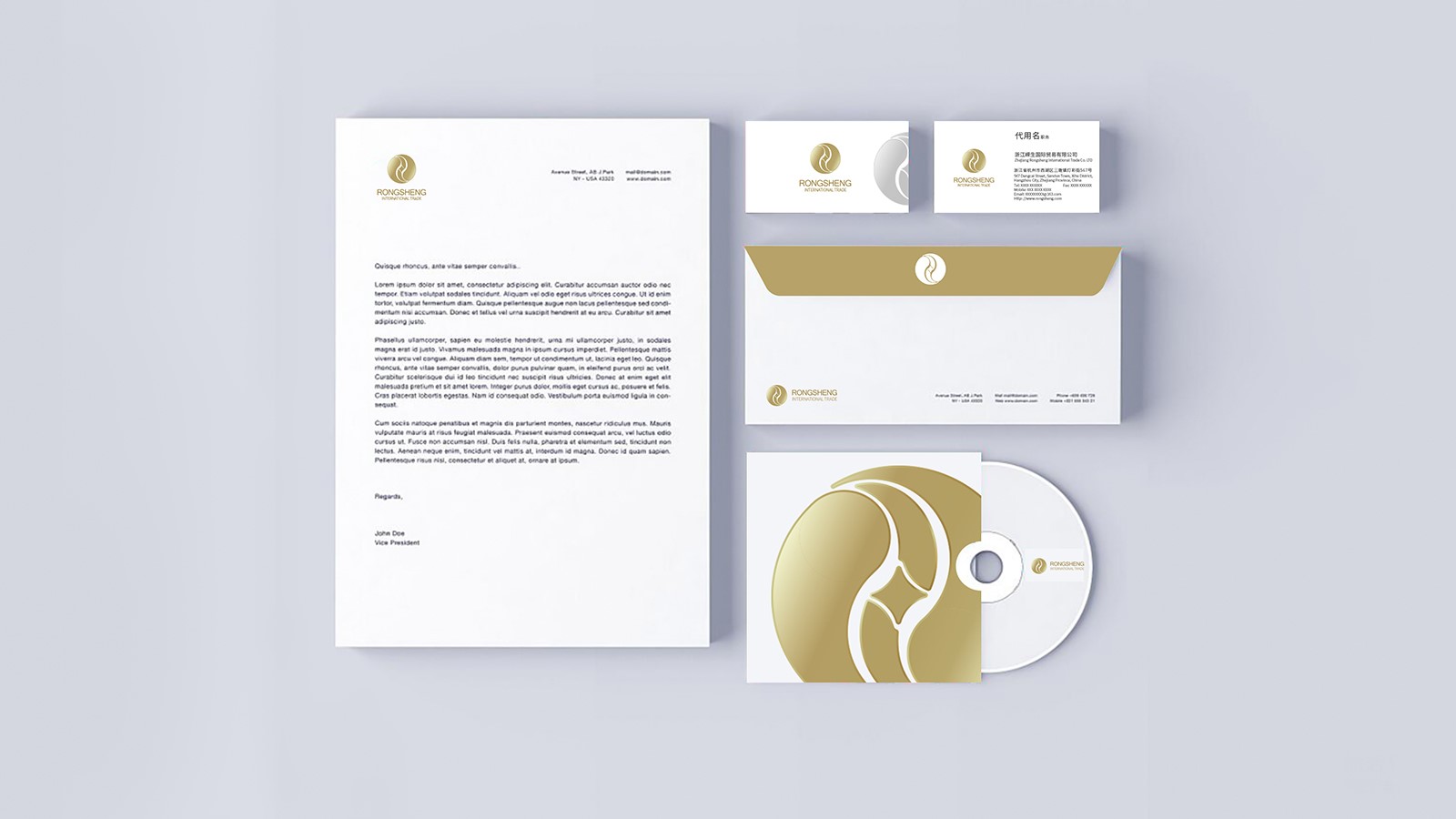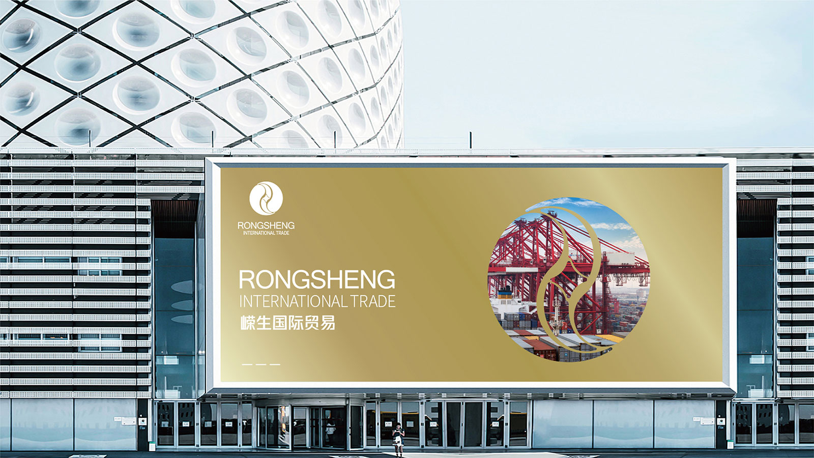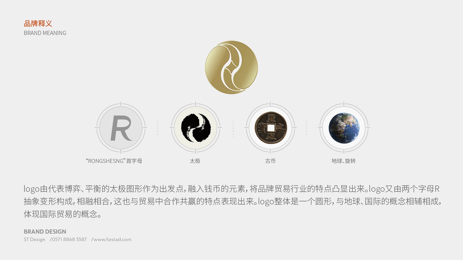 LOGO由代表博弈、平衡的太極圖形作為出發點,融入錢幣的元素,將品牌貿易行業的特點凸顯出來。logo又由兩個字母R抽象變形構成,相融相合,主也與貿易中合作共贏的特點表現出來。logo整體是一個圓形,與地球、國際的概念相輔相成,體現國際貿易的概念。