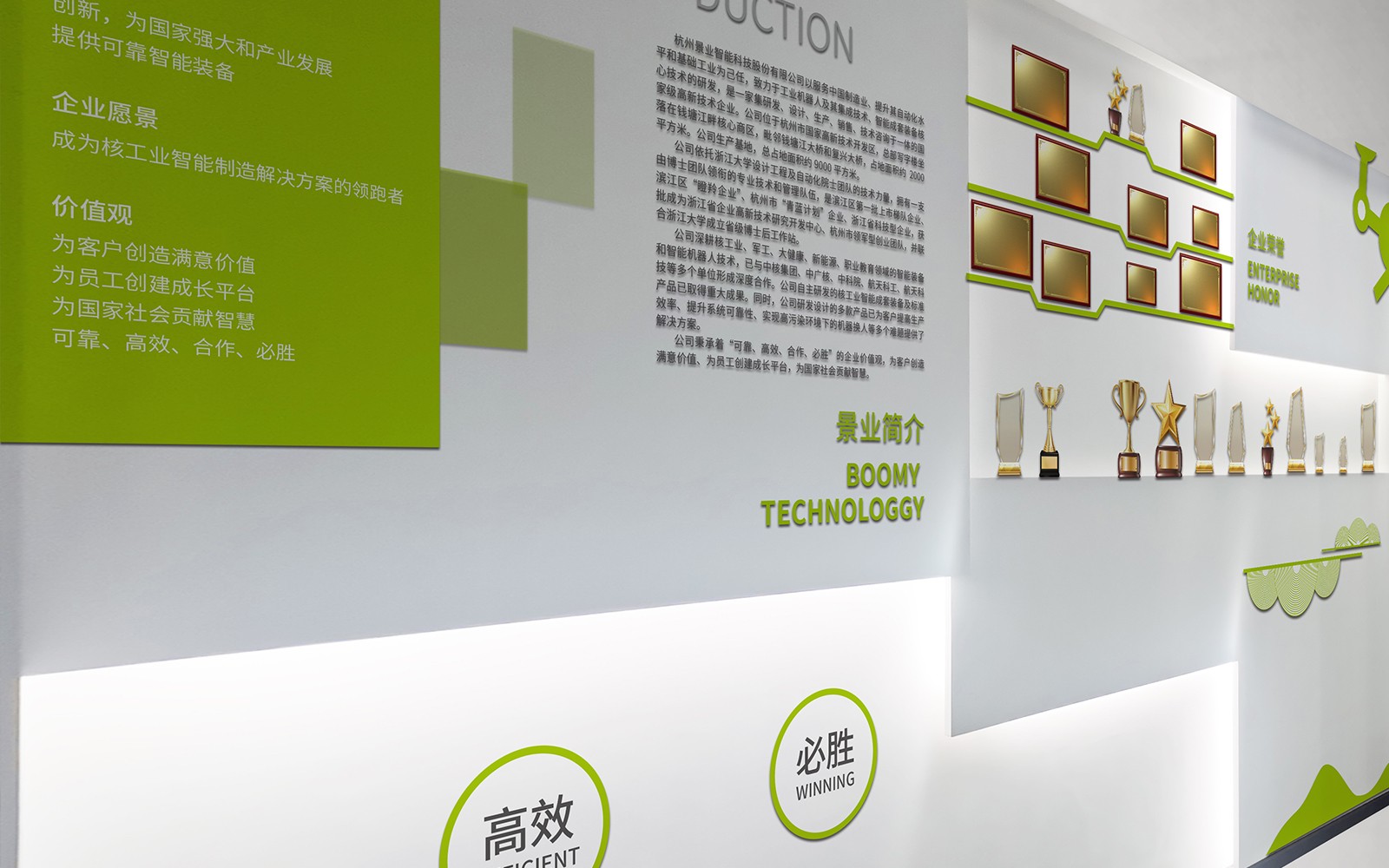 景業只能科技文化墻與榮譽墻的設計經過石特廣告的策劃,讓原本光禿禿的墻壁有了展示公司實力的窗口