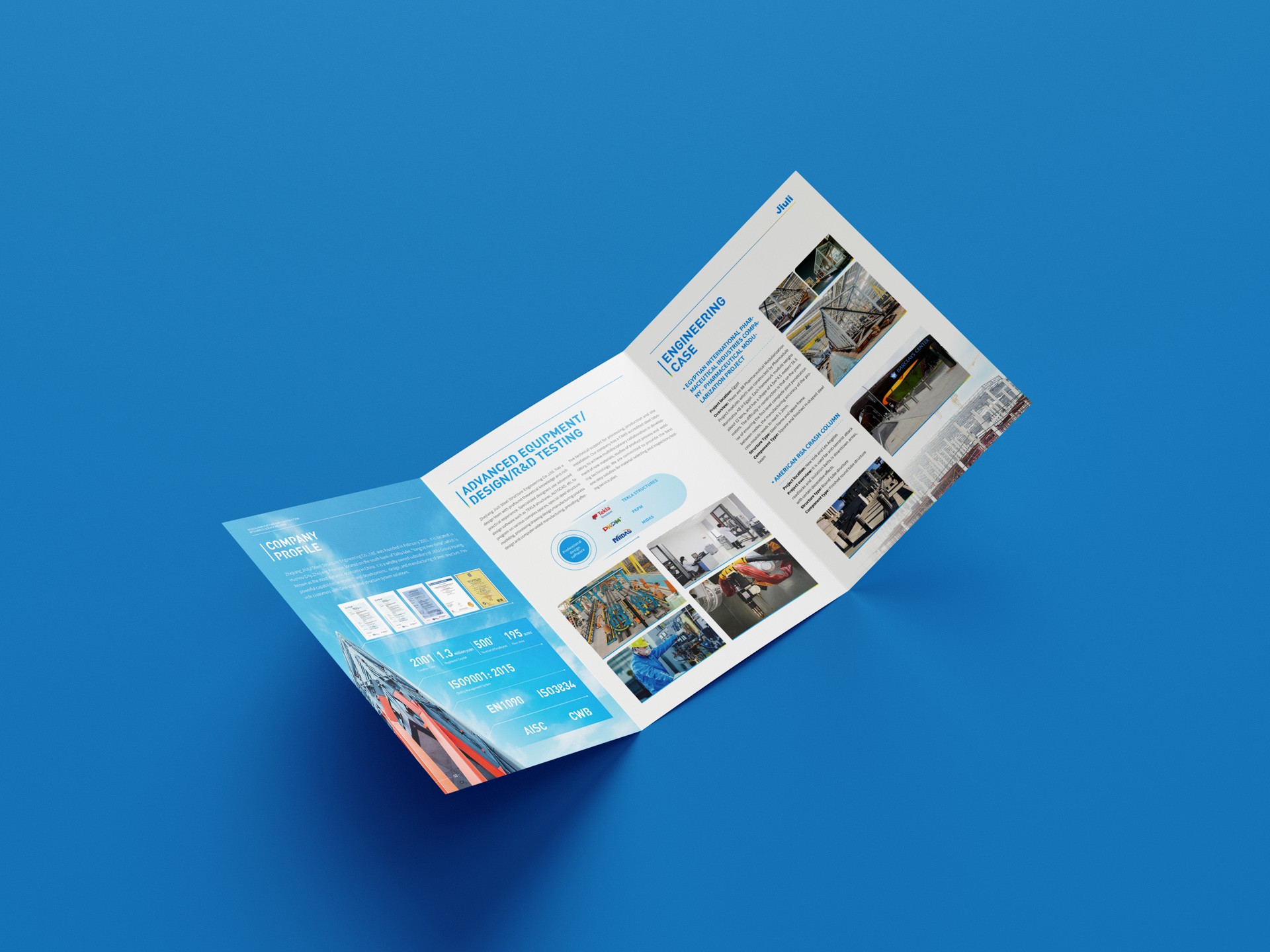 四、內容策劃與呈現:宣傳三折頁的內容策劃圍繞公司的核心優勢、業務范圍和成功案例展開。通過精煉的文字和生動的圖片,展示公司在鋼結構設計、制造、安裝等方面的專業能力和豐富經驗。同時,結合具體的項目案例,展示公司在各個領域的應用成果,增強客戶的信任感和認同感。