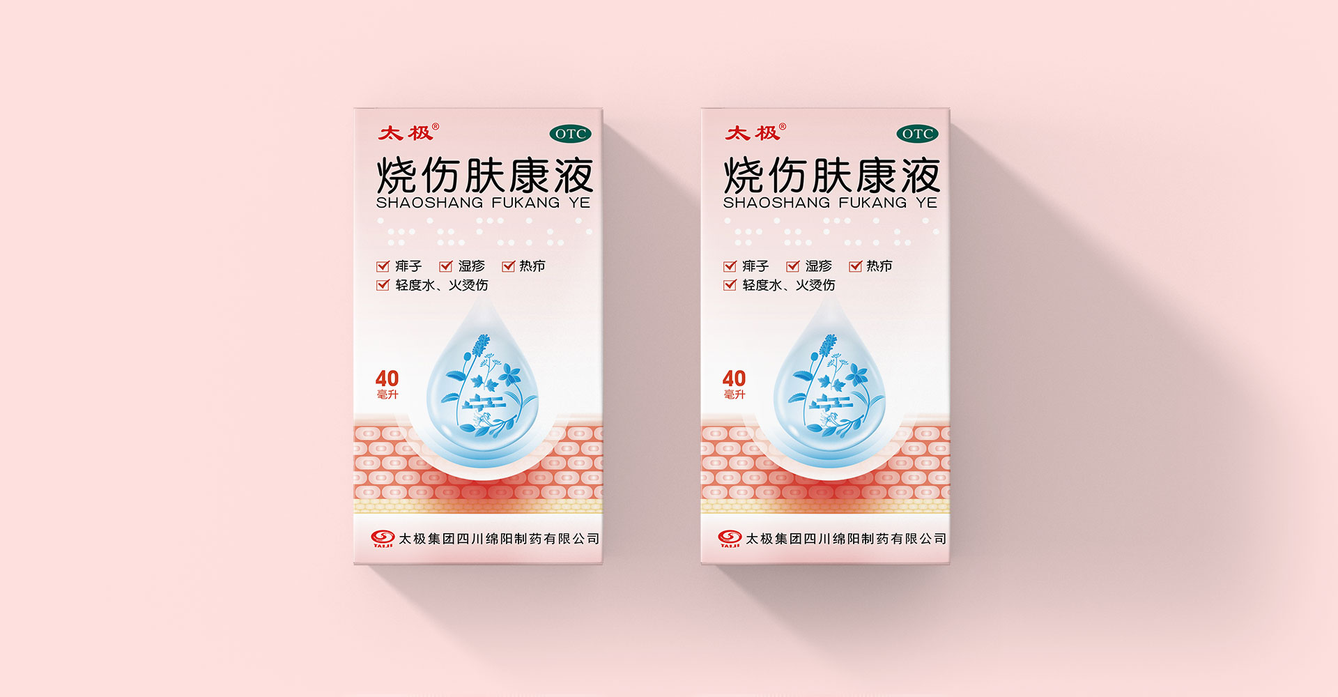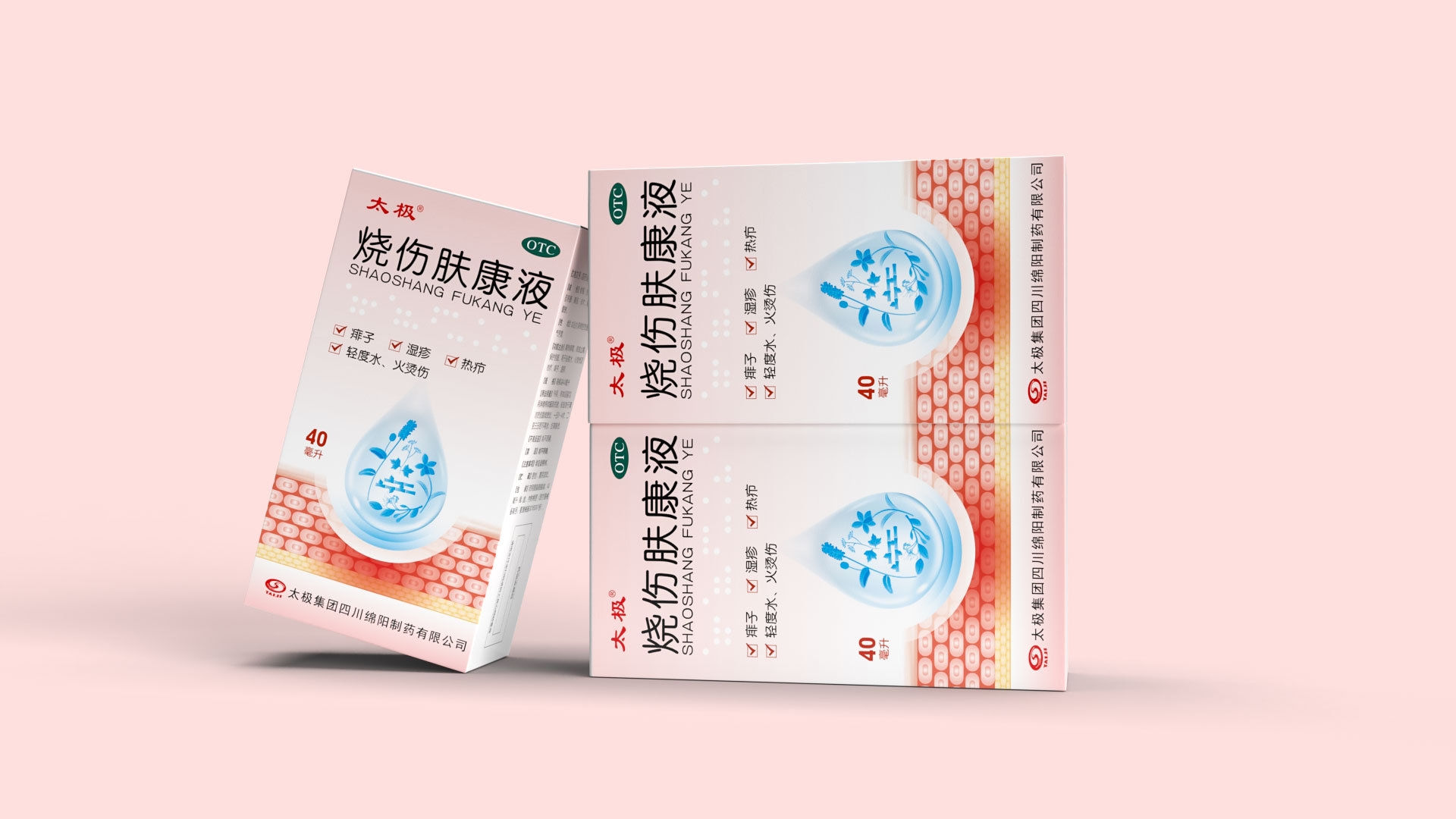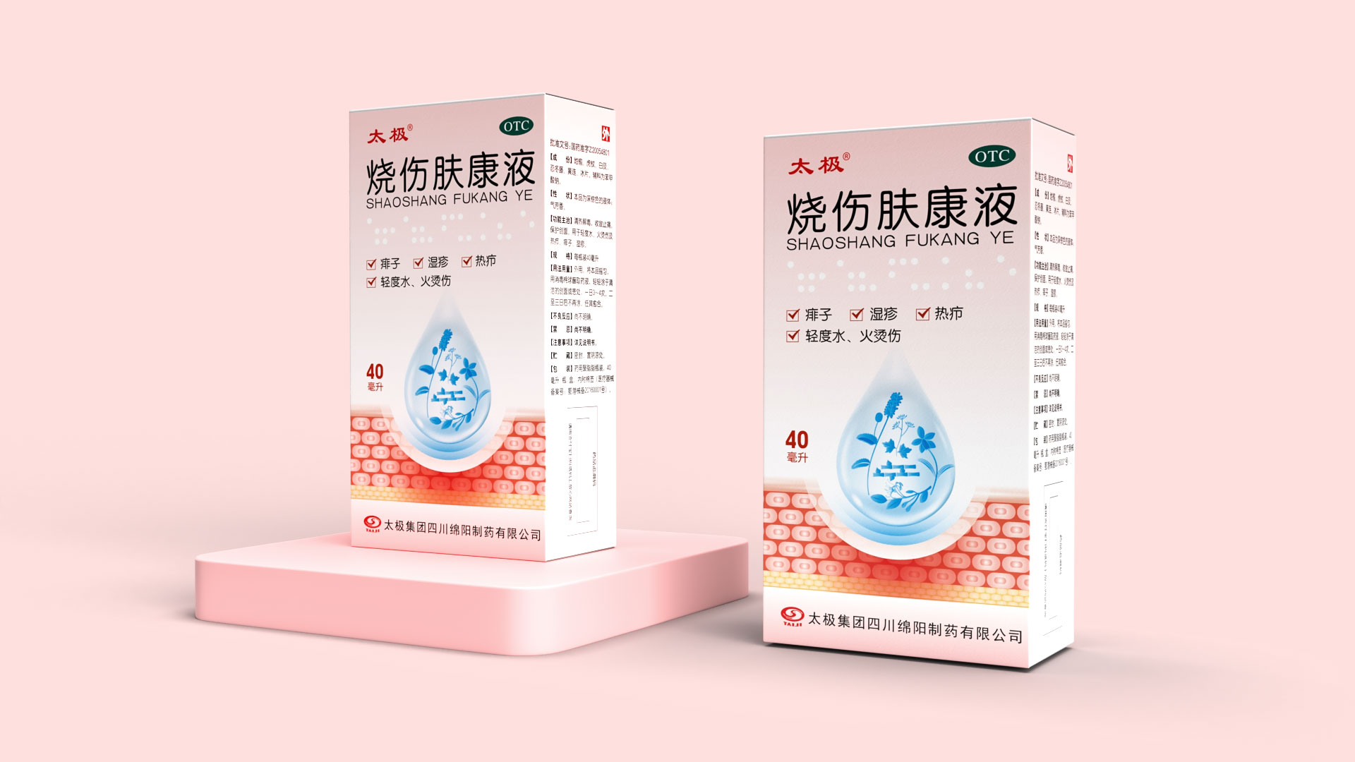 水滴形象生動地展現了產品的液態本質,而五味藥材環繞其周,恰似提煉了藥材的精粹,凝聚于這滴水珠之中,這一設計細節凸顯了產品中草藥的天然成分,以及其原生態、安全的特點。皮膚組織模擬皮膚受損時的泛紅和疼痛狀態,直觀地傳達了產品能夠精準、快速緩解癥狀的優勢。整體設計風格醒目且易于識別,與產品通用名“燒傷膚康液”高度契合。這種具象化的呈現方式讓消費者能夠直觀地理解產品的作用機制,從而更方便快捷地做出購買決策。