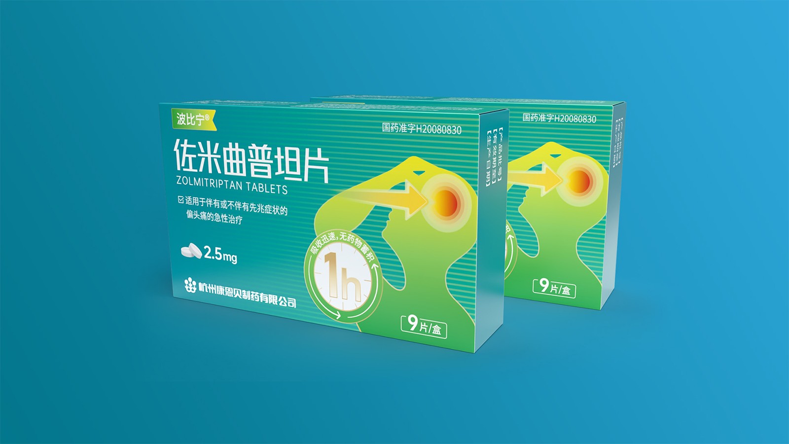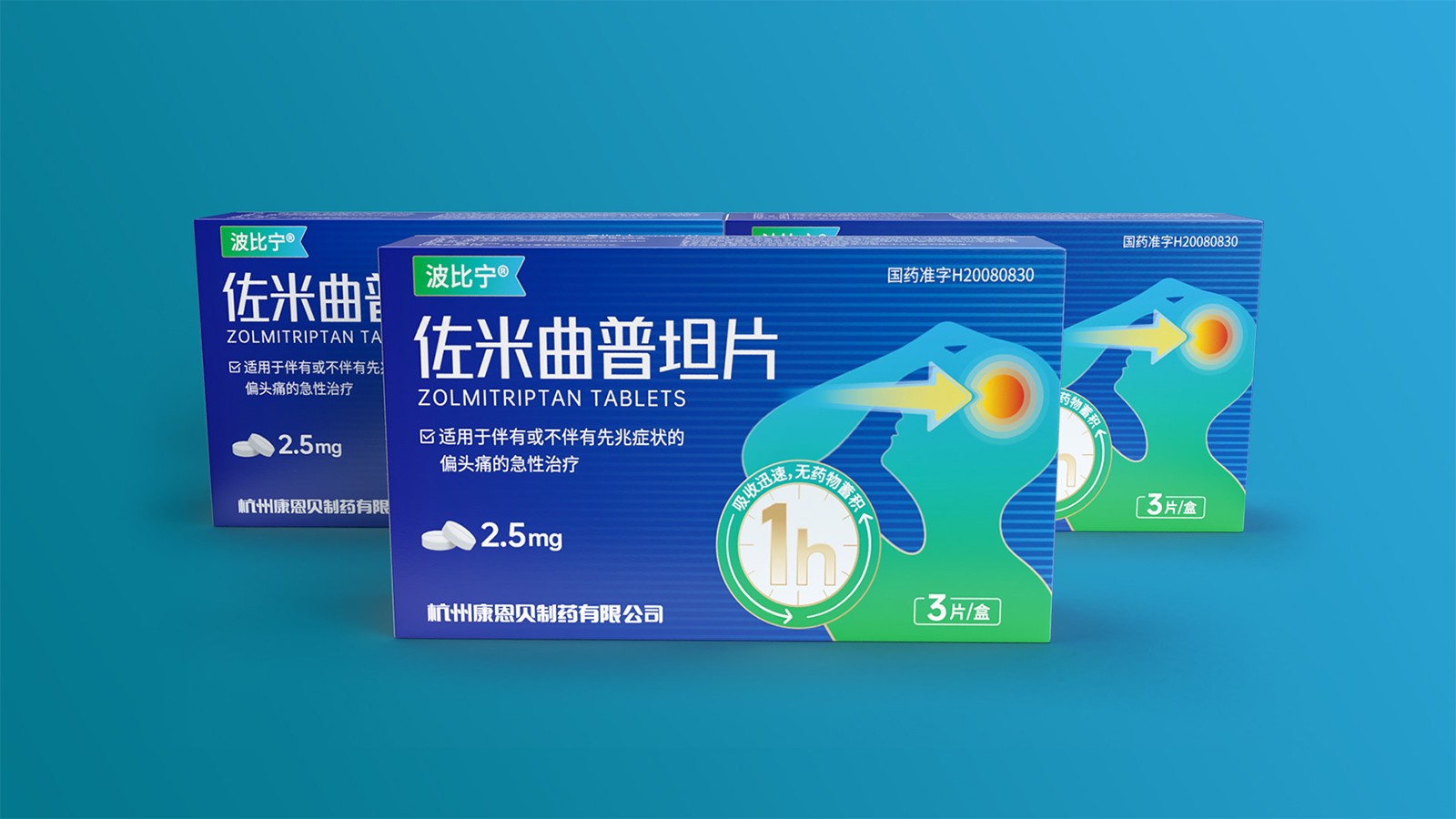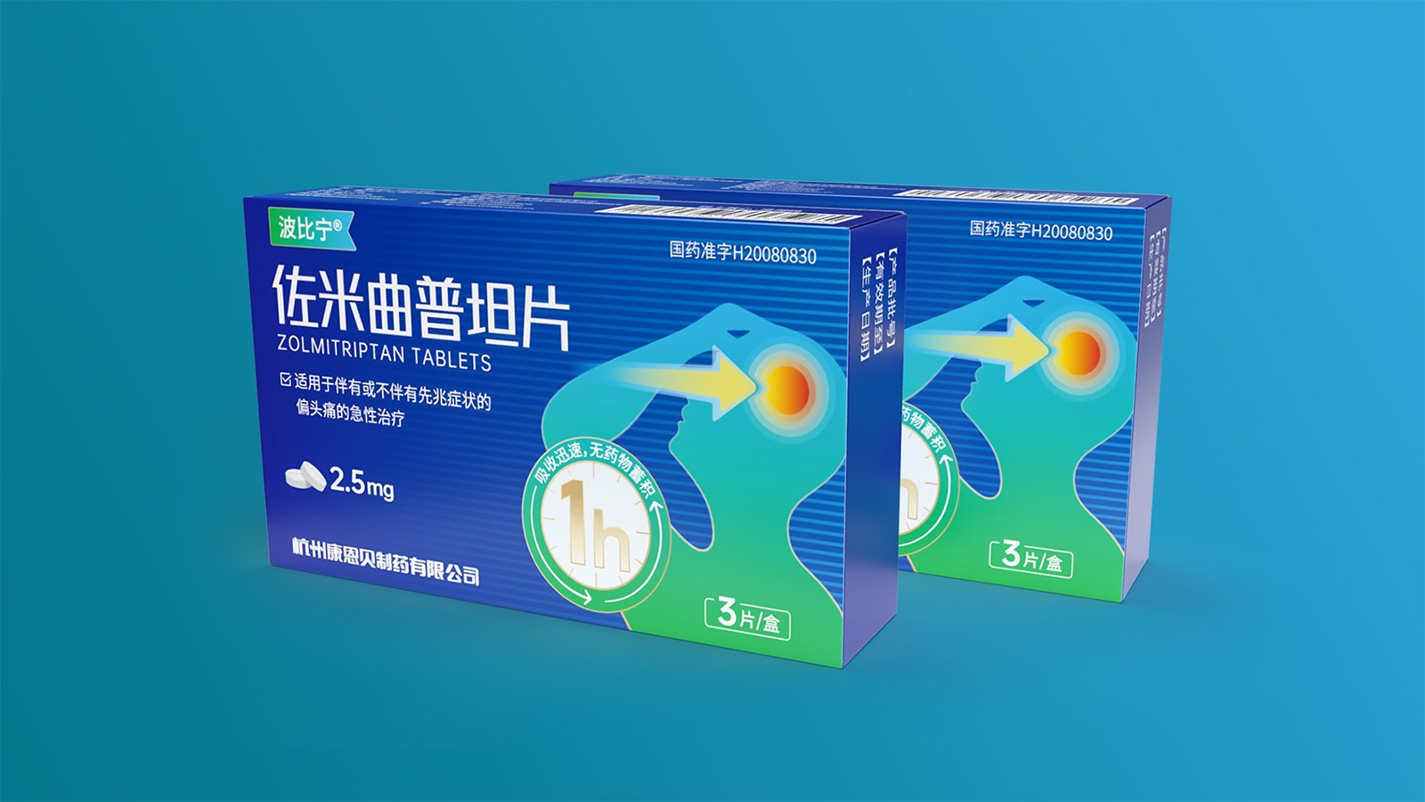石特綜合考慮產品的使用場景、產品功效、消費者心理等因素并結合創意對藥品的包裝設計提出方案。對于佐米曲普坦片的包裝,以藍色為主色,藍色寓意健康,添加人體頭部剪影并展示頭痛癥狀,可以凸顯藥品的功效,被放大的1h也可以告訴人們該藥品的見效快速