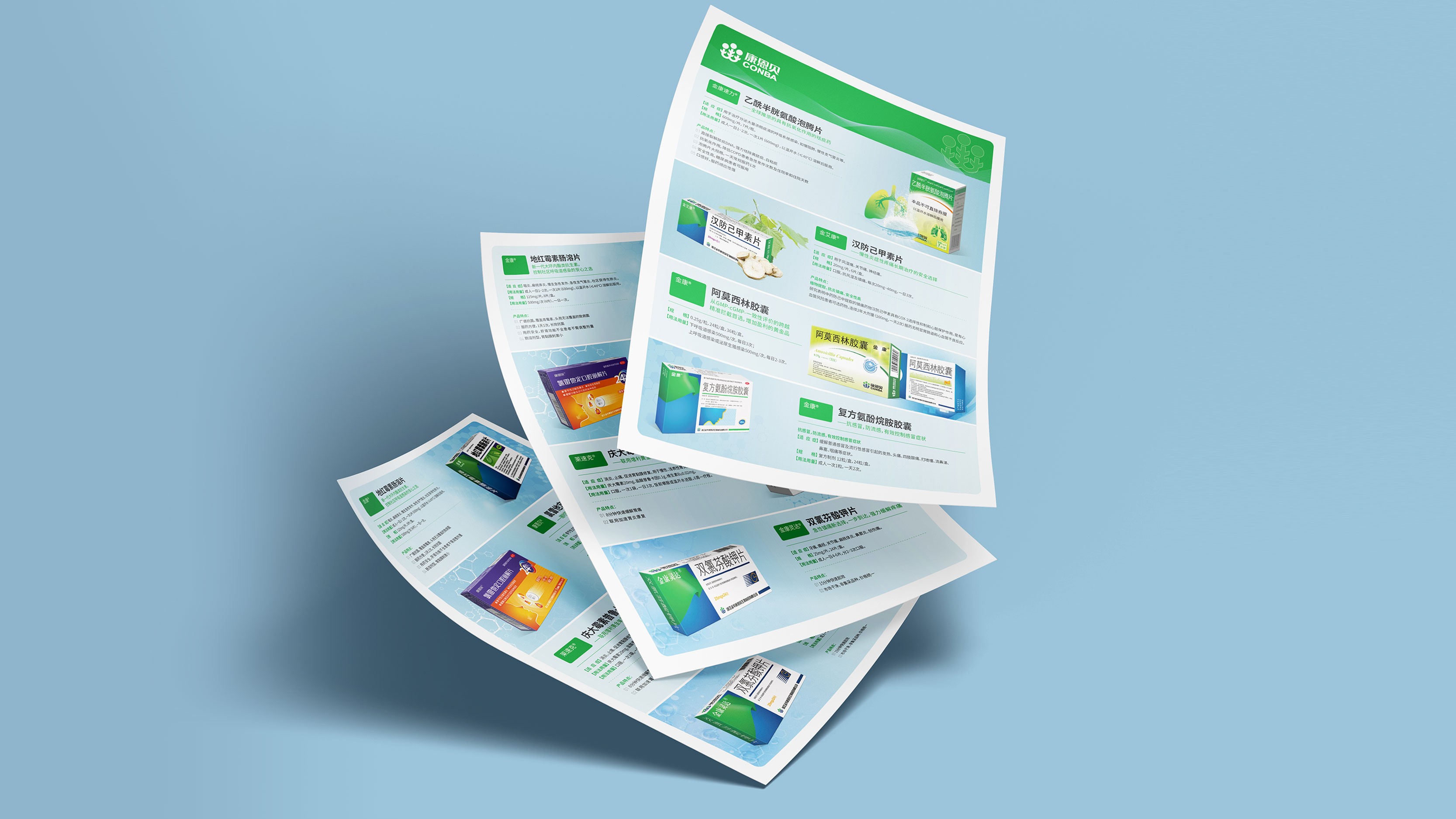 石特考慮到藥品的單頁具有針對性、獨立性的特點,因此在此次的設計中,石特根據藥品特點,藥物療效、進行構思:在產品的單頁設計上主要以綠色為主,藍色輔色為底色,綠色代表著健康,符合金康醫藥的行業定位,藍色與綠色的配合在視覺上給人一種清新的感覺,使人看了輕松愉悅;以圖文結合形式展示藥品,使閱讀更加便捷。
