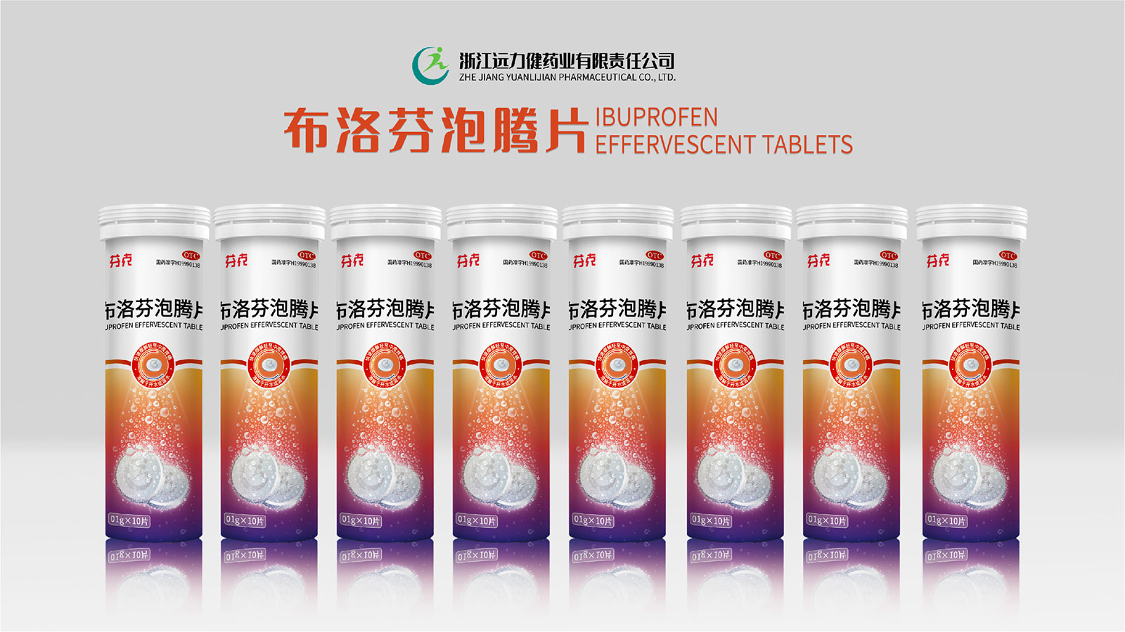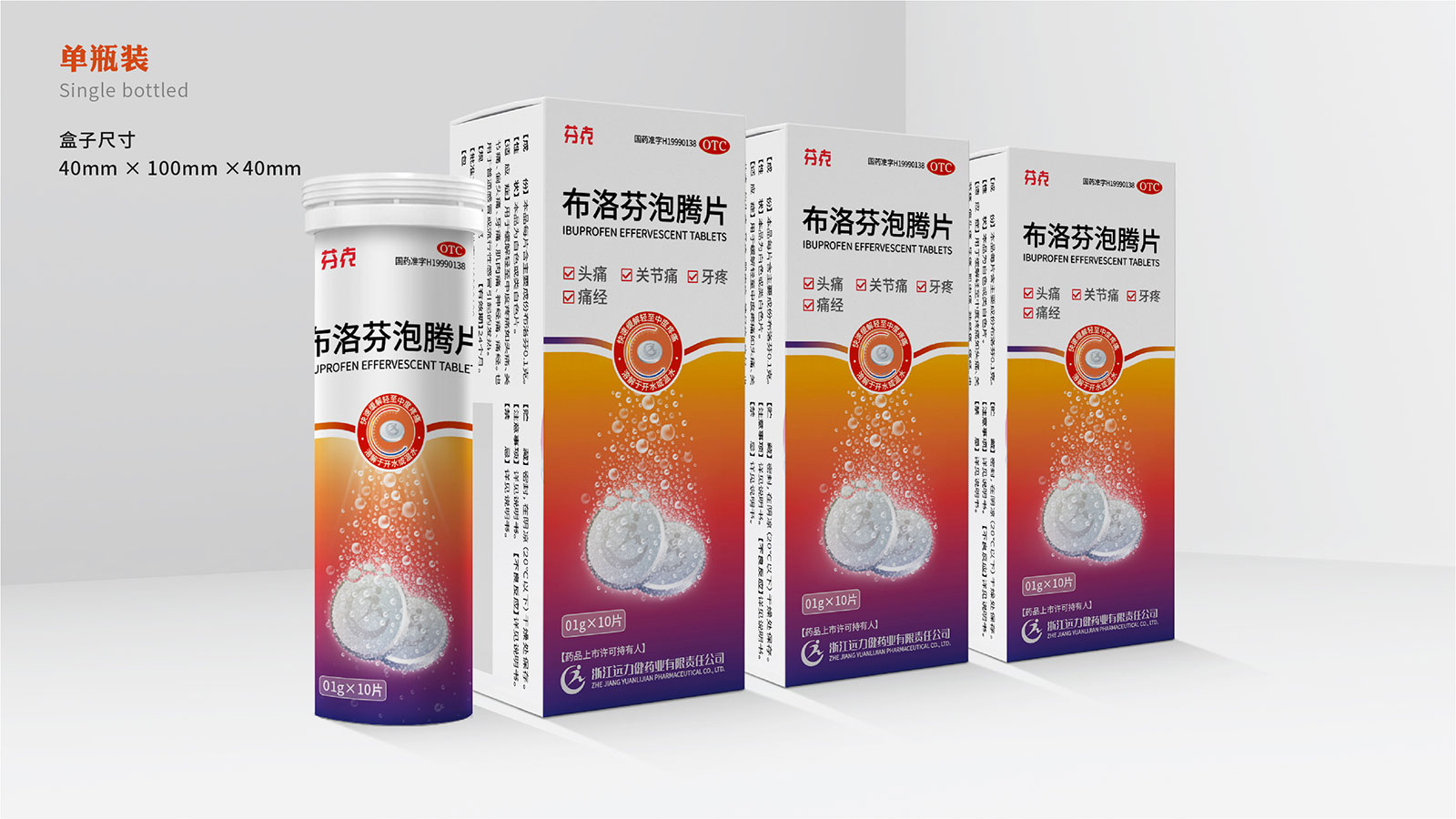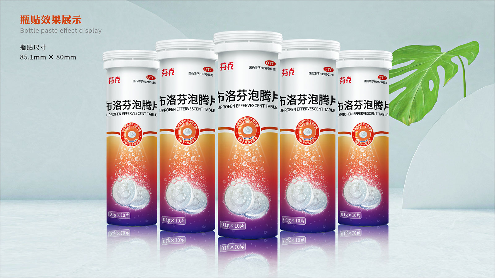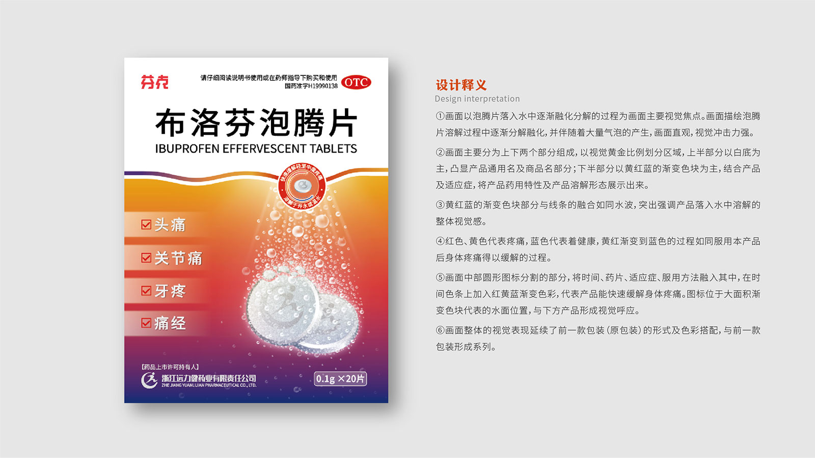 ③黃紅藍(lán)的漸變色塊部分與線條的融合如同水波,突出強(qiáng)調(diào)產(chǎn)品落入水中溶解的整體視覺感。④紅色、黃色代表疼痛,藍(lán)色代表著健康,黃紅漸變到藍(lán)色的過程如同服用本產(chǎn)品后身體疼痛得以緩解的過程。⑤畫面中部圓形圖標(biāo)分割的部分,將時間、藥片、適應(yīng)癥、服用方法融入其中,在時間色條上加入紅黃藍(lán)漸變色彩,代表產(chǎn)品能快速緩解身體疼痛。圖標(biāo)位于大面積漸變色塊代表的水面位置,與下方產(chǎn)品形成視覺呼應(yīng)。⑥畫面整體的視覺表現(xiàn)延續(xù)了前一款包裝(原包裝)的形式及色彩搭配,與前一款包裝形成系列。