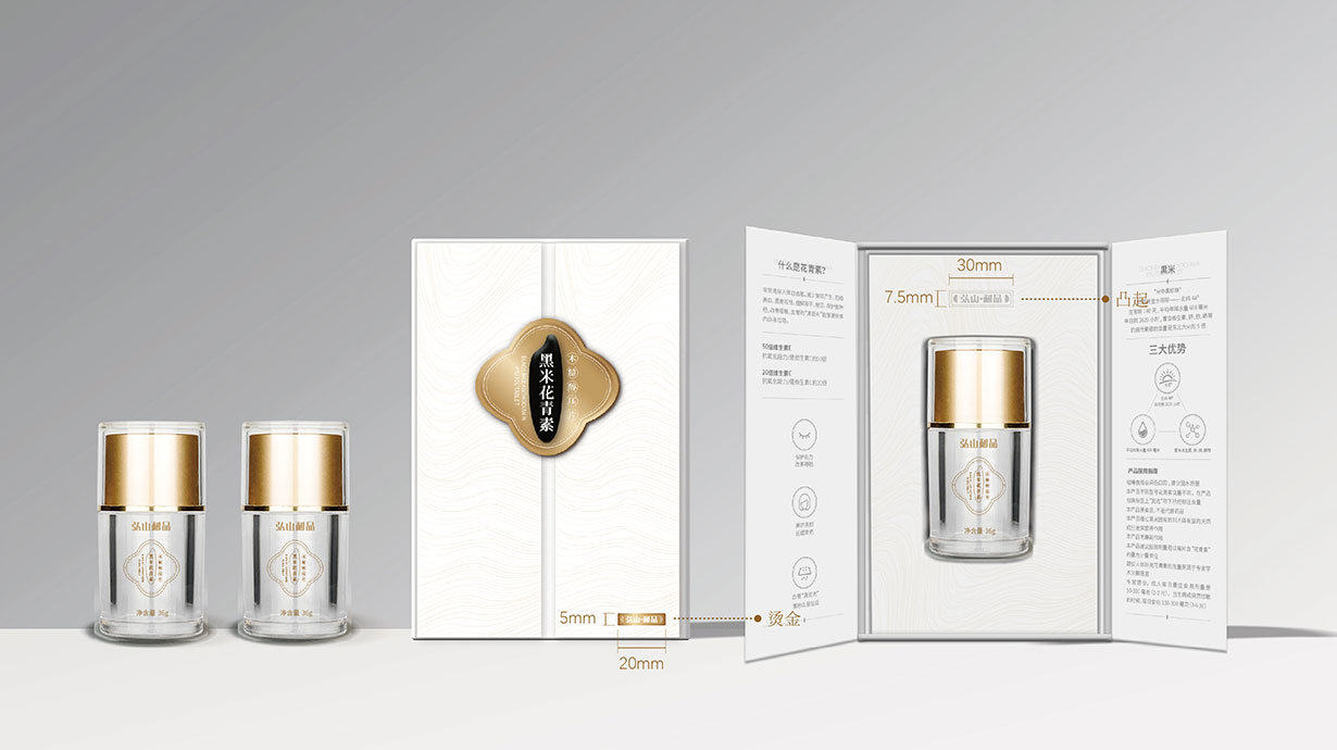 首先內盒采用透明食用級亞克力瓶身,對品牌獨有標牌和弘山利品品牌標簽進行設計,黑米+花的形狀,結合黑米的黑,體現“米中黑珍珠”的營養價值;再用金色,其一含義是黑米稻穗的顏色,體現天然無添加的自然感受;其二含義是黑米花青素是色素之精品,體現其高貴地位。通過包裝升級統一形象后,深化了弘山禮品在用戶心中的外在形象,品類包裝問題得以解決。