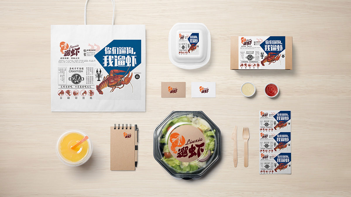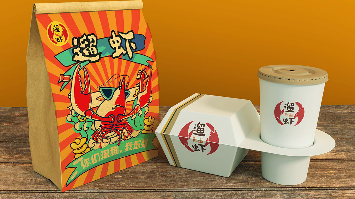 全案策劃遛蝦品牌,你們遛狗我遛蝦廣告語定位,產品包裝及供應鏈物料設計,為其打造高檔外賣龍蝦品牌。外賣龍蝦包裝盒 設計,一次性外賣打包盒設計, 夜宵類打包盒設計, 外賣餐盒等設計。