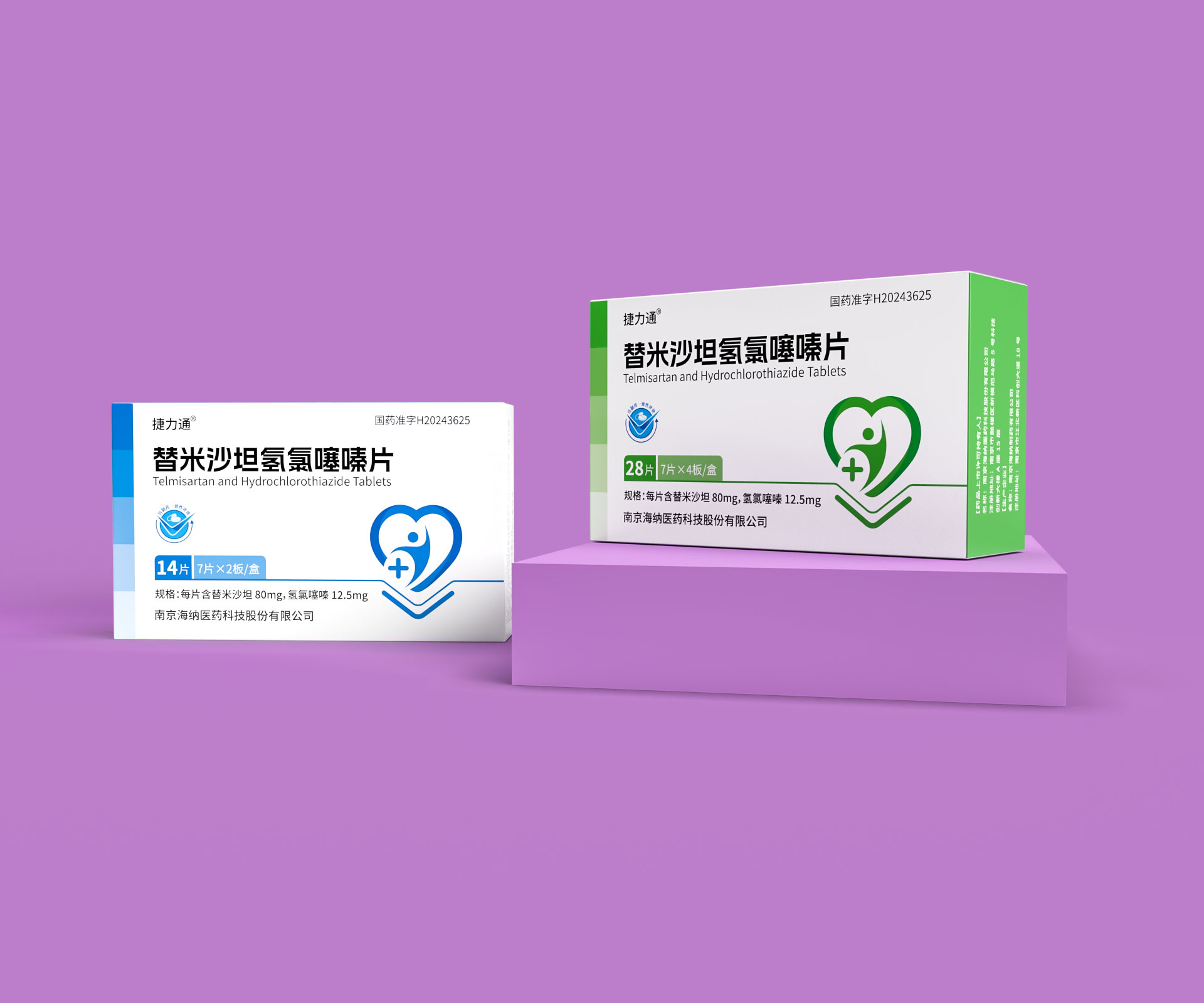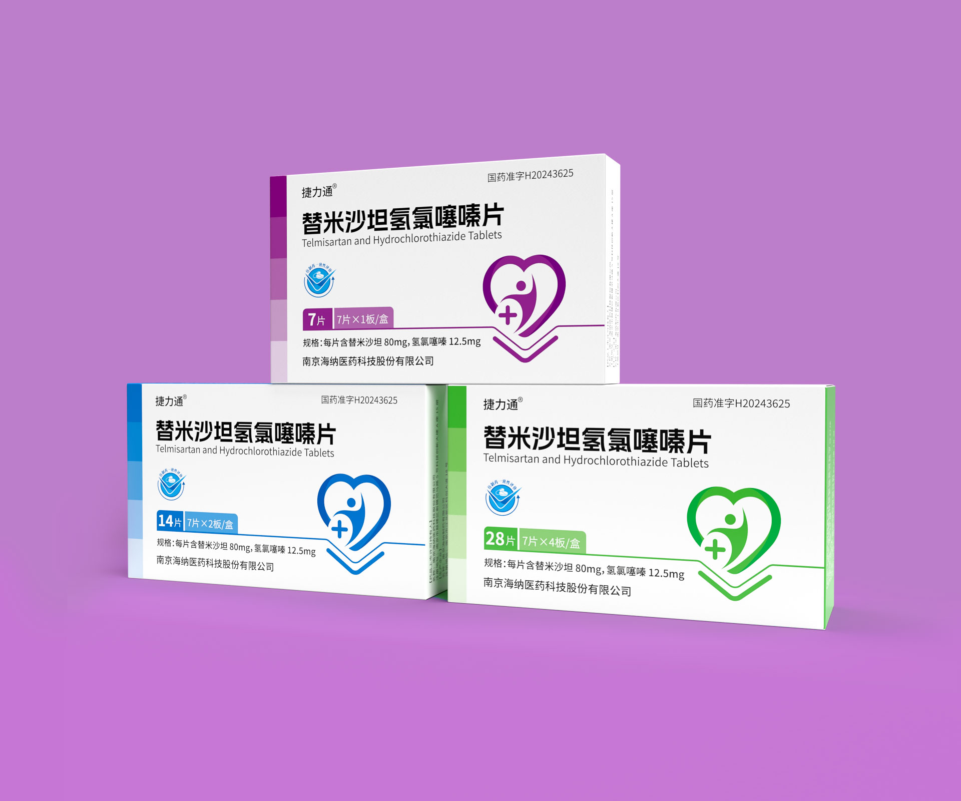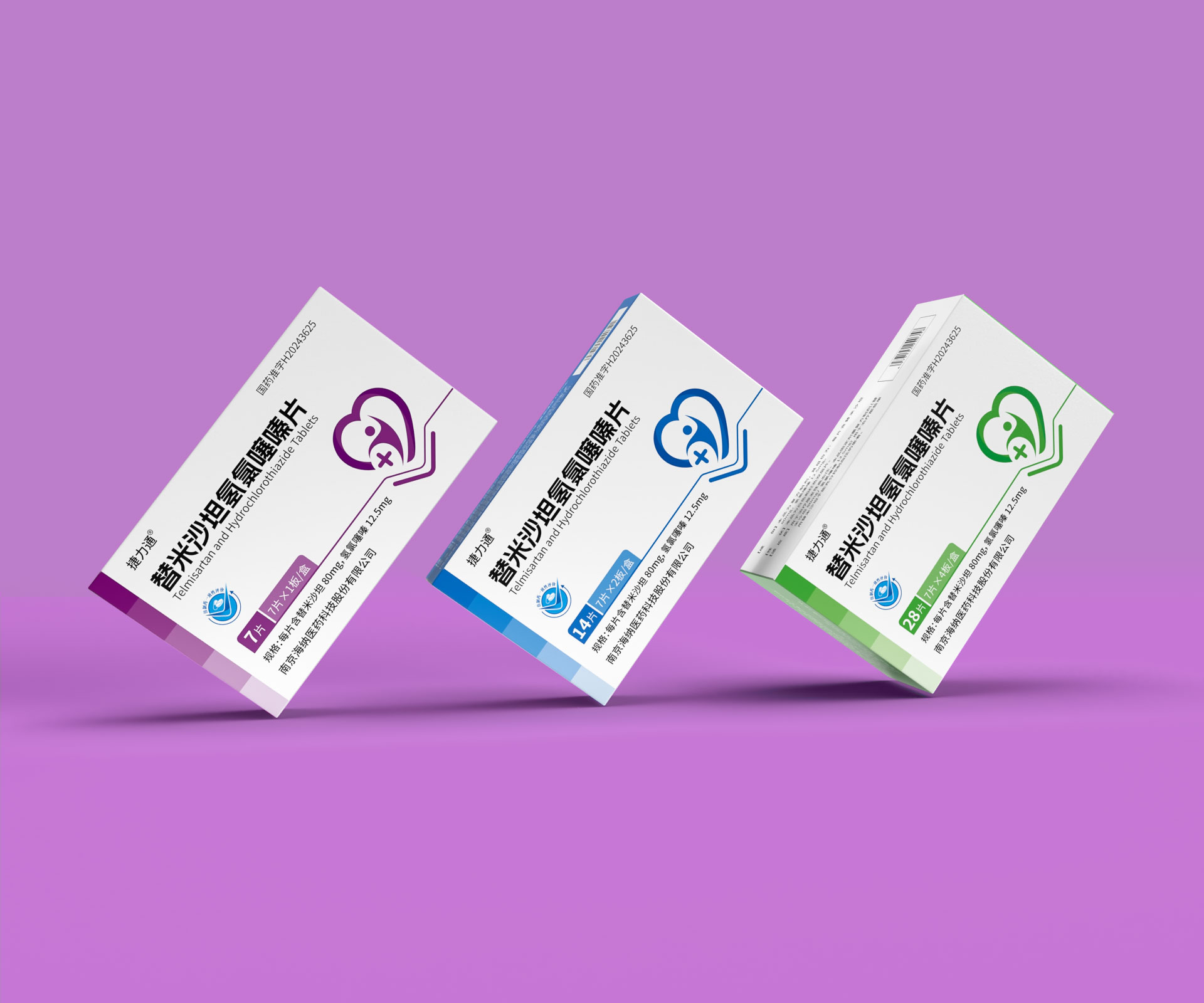 德捷(上海)生物醫藥科技有限公司的替米沙坦氫氯噻嗪片(規格:28片/盒、14片/盒及7片便攜裝)是一款用于治療原發性高血壓的復方制劑,具備多劑量靈活適配的臨床需求。針對其多規格產品線,石特大健康團隊以“精準識別、安全高效、品牌統一”為設計目標,打造了系列化藥品包裝解決方案,覆蓋差異化規格適配、防偽追溯、用戶場景細分及合規化設計,通過模塊化結構、家族化視覺體系與智能化生產適配,助力企業提升多規格產品管理效率與終端市場競爭力。