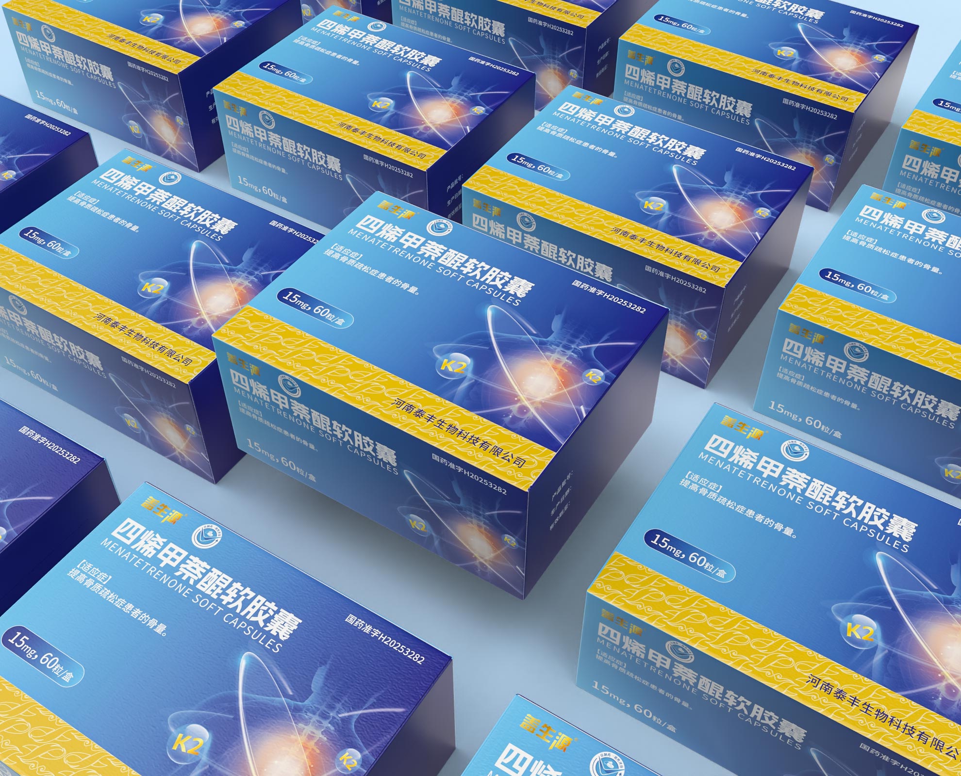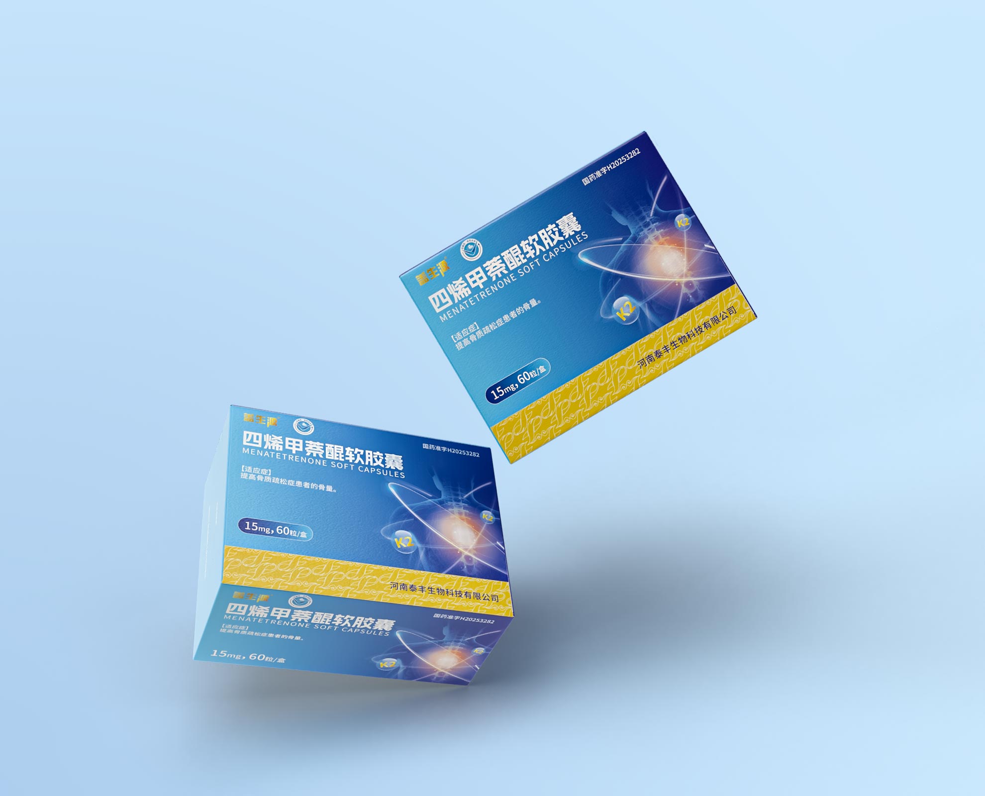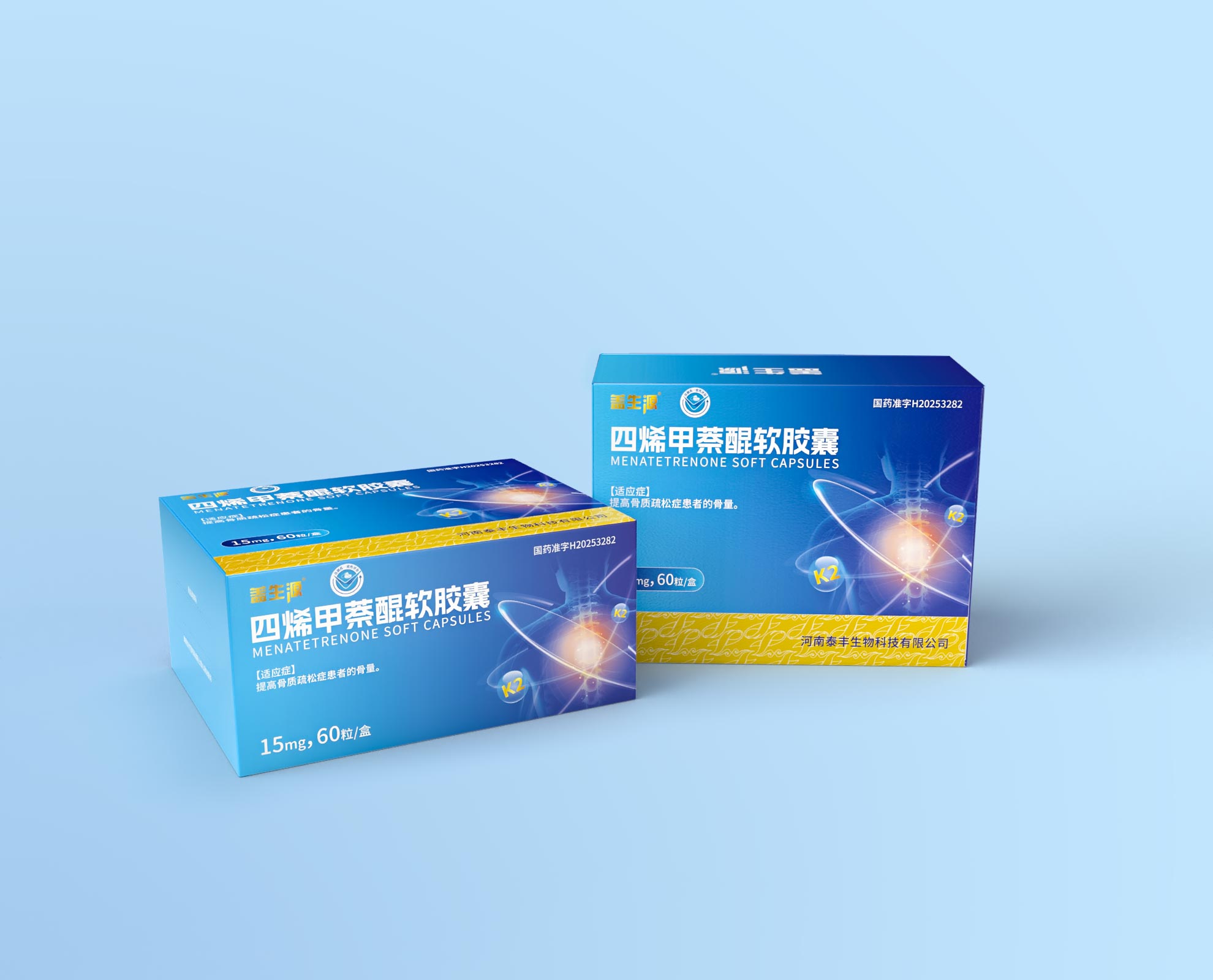 • 信息規范:嚴格遵循醫藥包裝法規,清晰展示 “國藥準字 H20253282” 等批準文號、“河南泰豐生物科技有限公司” 生產信息,確保合規性;同時優化排版,讓產品名稱 “四烯甲萘醌軟膠囊(MENATETRENONE SOFT CAPSULES)” 、適應癥等關鍵內容醒目呈現,助力專業人士及消費者快速獲取信息。