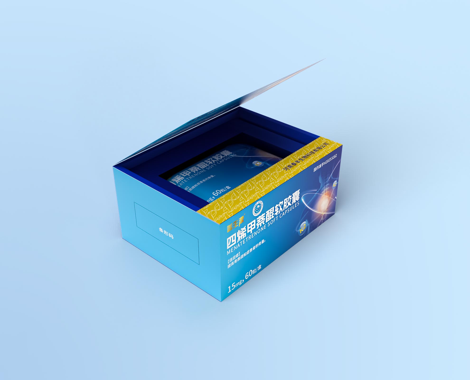 此次包裝設計,石特大健康以專業設計語言,為泰豐生物四烯甲萘醌軟膠囊打造兼具合規性、實用性與品牌辨識度的產品禮盒,助力醫藥產品打通 “專業屬性傳遞 - 消費體驗提升 - 品牌價值沉淀” 的市場路徑,為醫藥健康產品包裝升級提供優質范例 。
