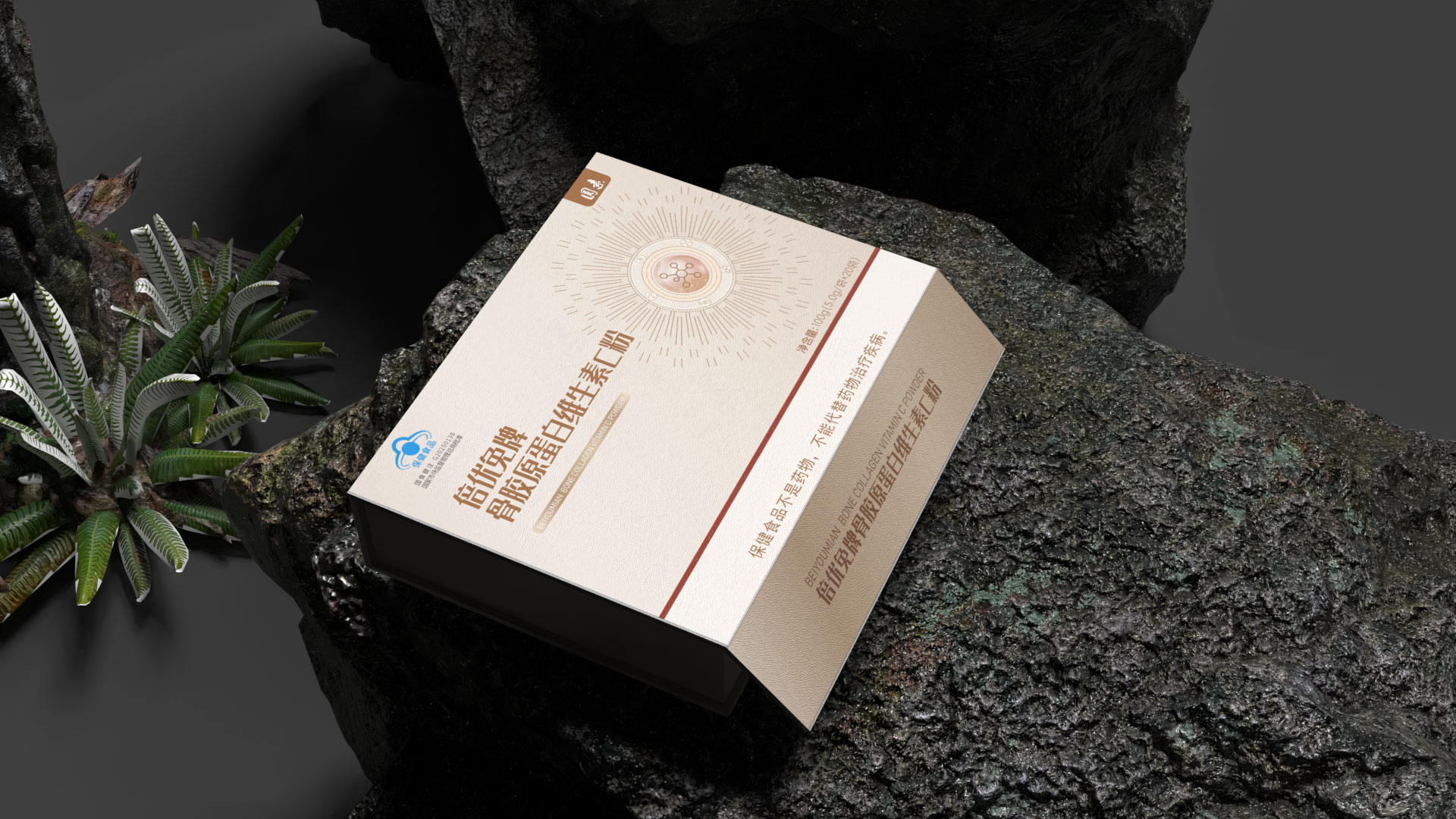 圖形符號: 設計了一個抽象的 “分子融合” 圖標,巧妙地將膠原蛋白螺旋結構與維生素C分子形態相結合,直觀傳達“科學配比,協同增效”的產品核心。