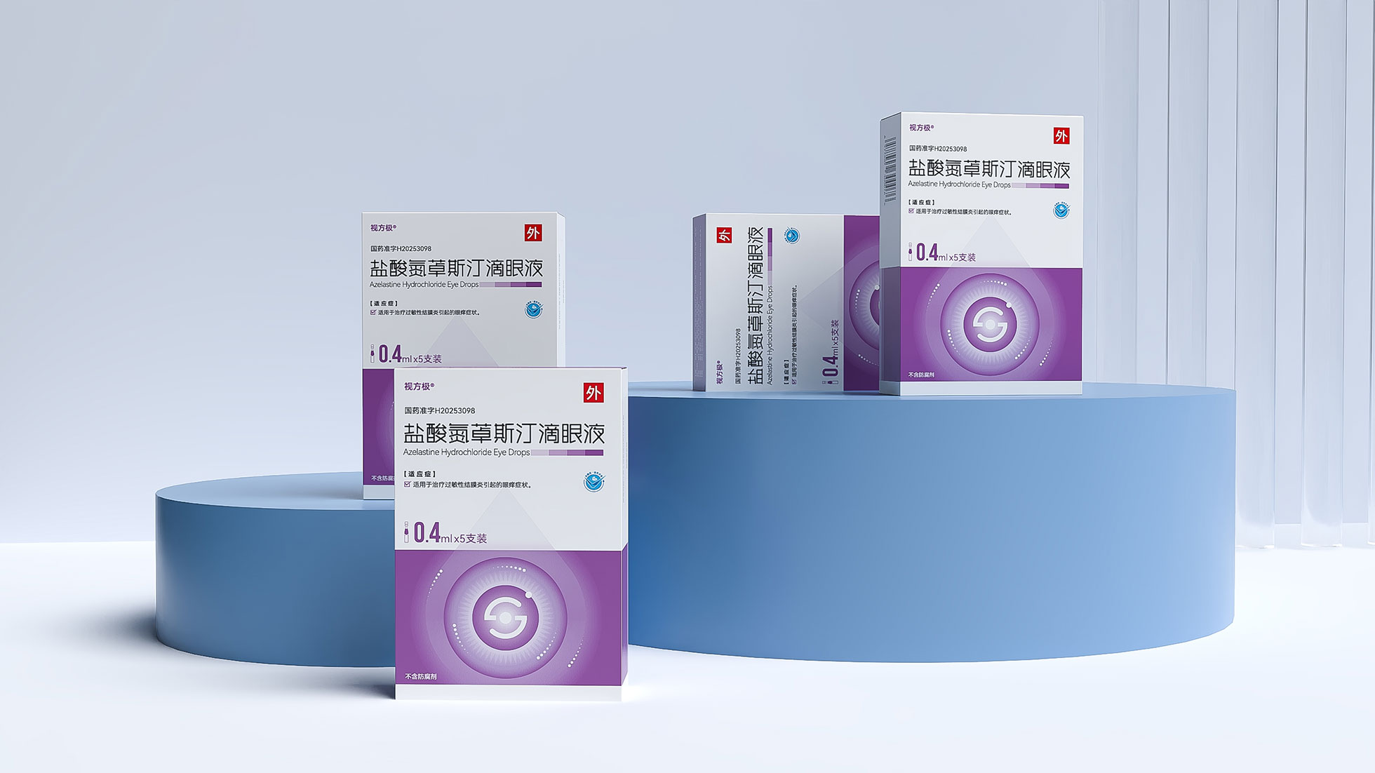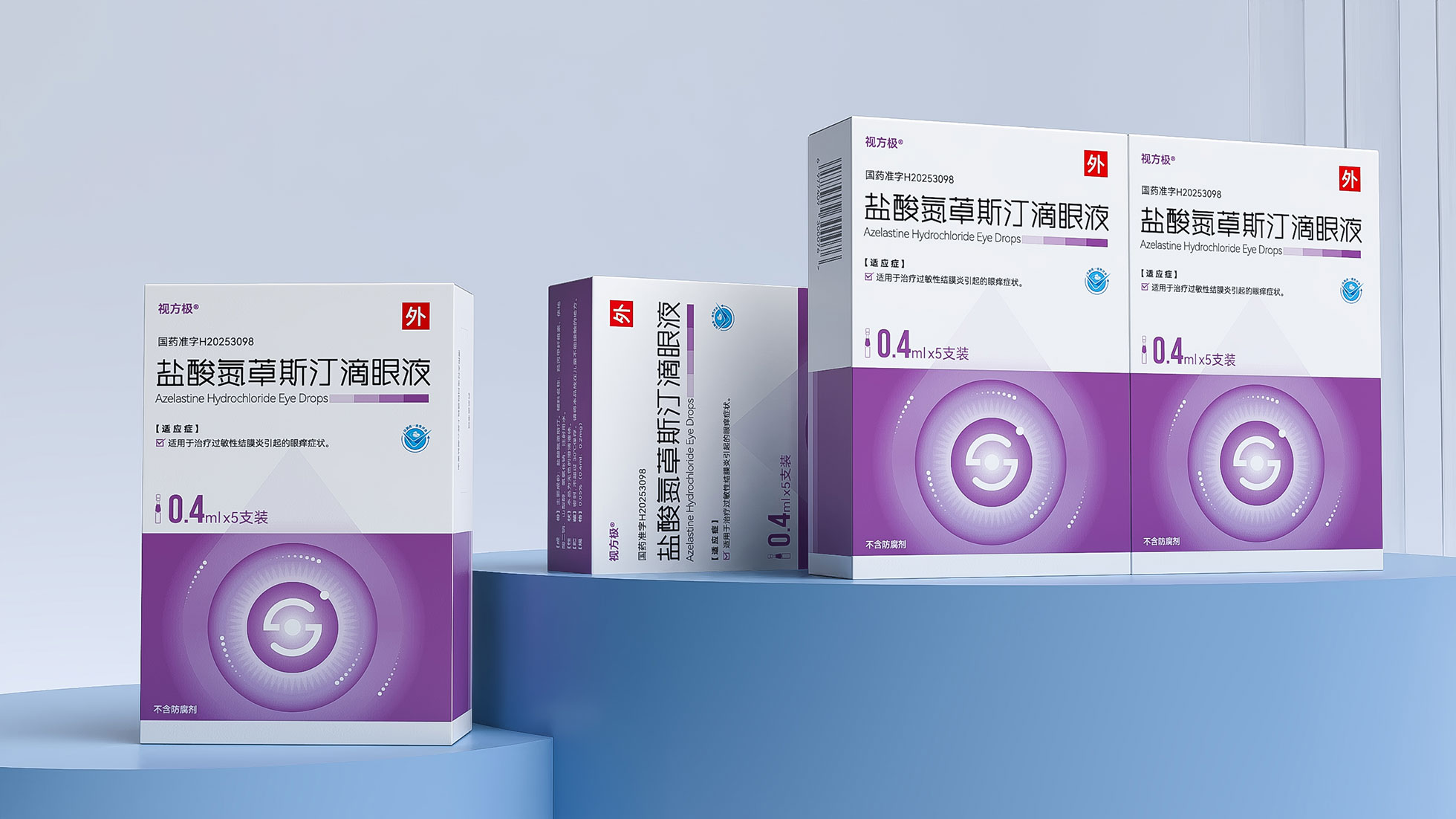 本項目是石特大健康為浙江視方極醫藥科技有限公司的核心產品——鹽酸氮?斯汀滴眼液,所提供的從終端包裝到專業DA(Detail Aid) 的一站式整合設計服務。該產品用于治療過敏性結膜炎,其市場成功既依賴于在藥店貨架上對消費者的直接吸引力,也離不開面向眼科醫生的專業學術推廣。我們的挑戰在于,如何構建一個統一的品牌視覺體系,使其在包裝上能清晰傳遞產品功效、激發購買欲望,同時在DA上能專業地呈現藥物機理和臨床優勢,成為醫生可信賴的處方依據,最終實現“藥店動銷”與“臨床推廣”的雙輪驅動。